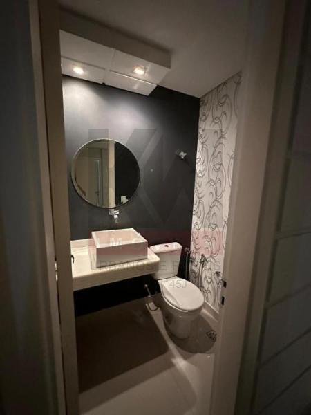 * espaço gourmet completo com balcão refrigerado e banheiro com armário planejado