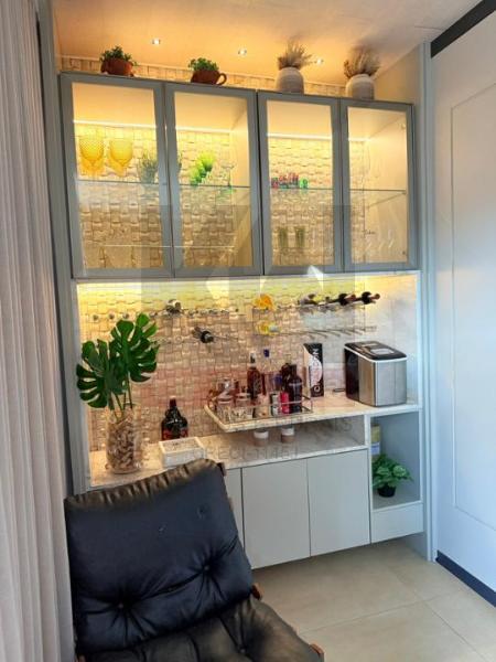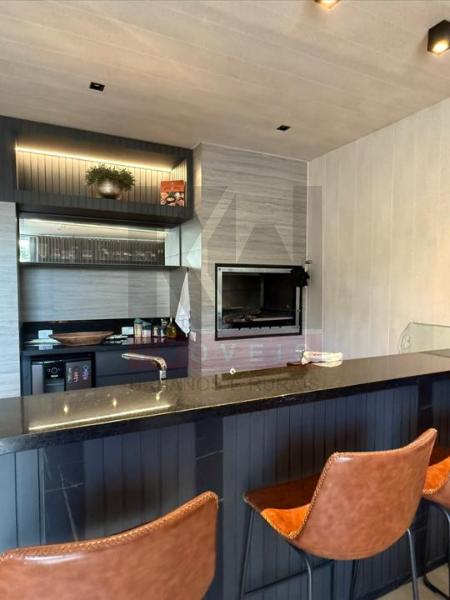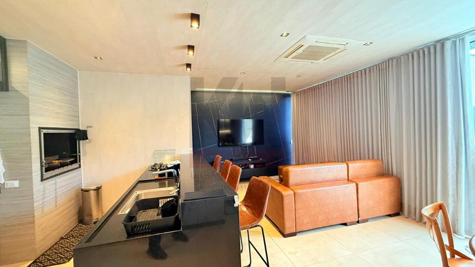 Área gourmet climatizada, com espaço de TV e banheiro